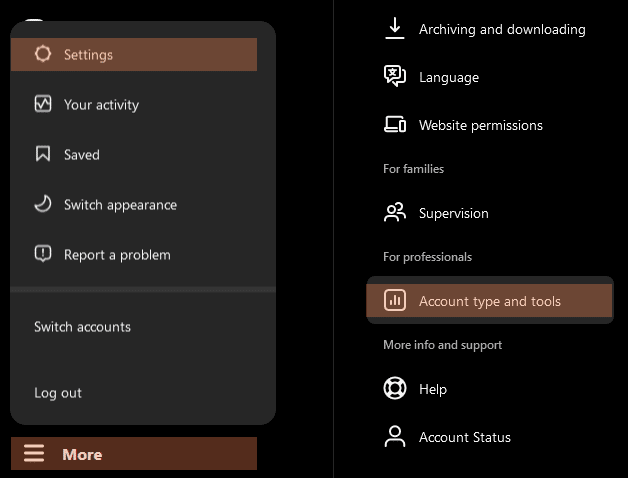 - Click Account type and tools, and Switch to Professional Account.