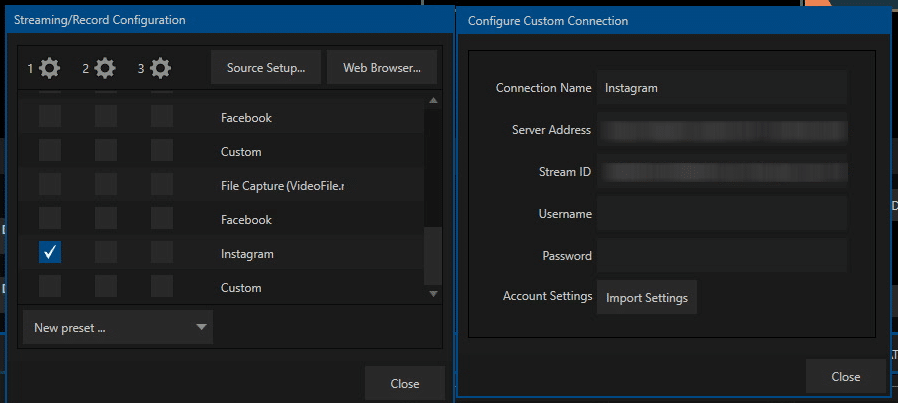 Please name your connection. In this example, we chose the name “Instagram”. The copied Stream URL from the Instagram dialog window (starting with rtmps://…) should go to the Server Address field, while the Stream Key should be copied to the Stream ID field.
