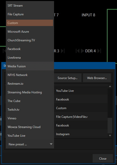 Navigate back to the TriCaster, click on the cogwheel icon of the TriCaster Streaming / Encoder menu, and create a new Custom Preset.