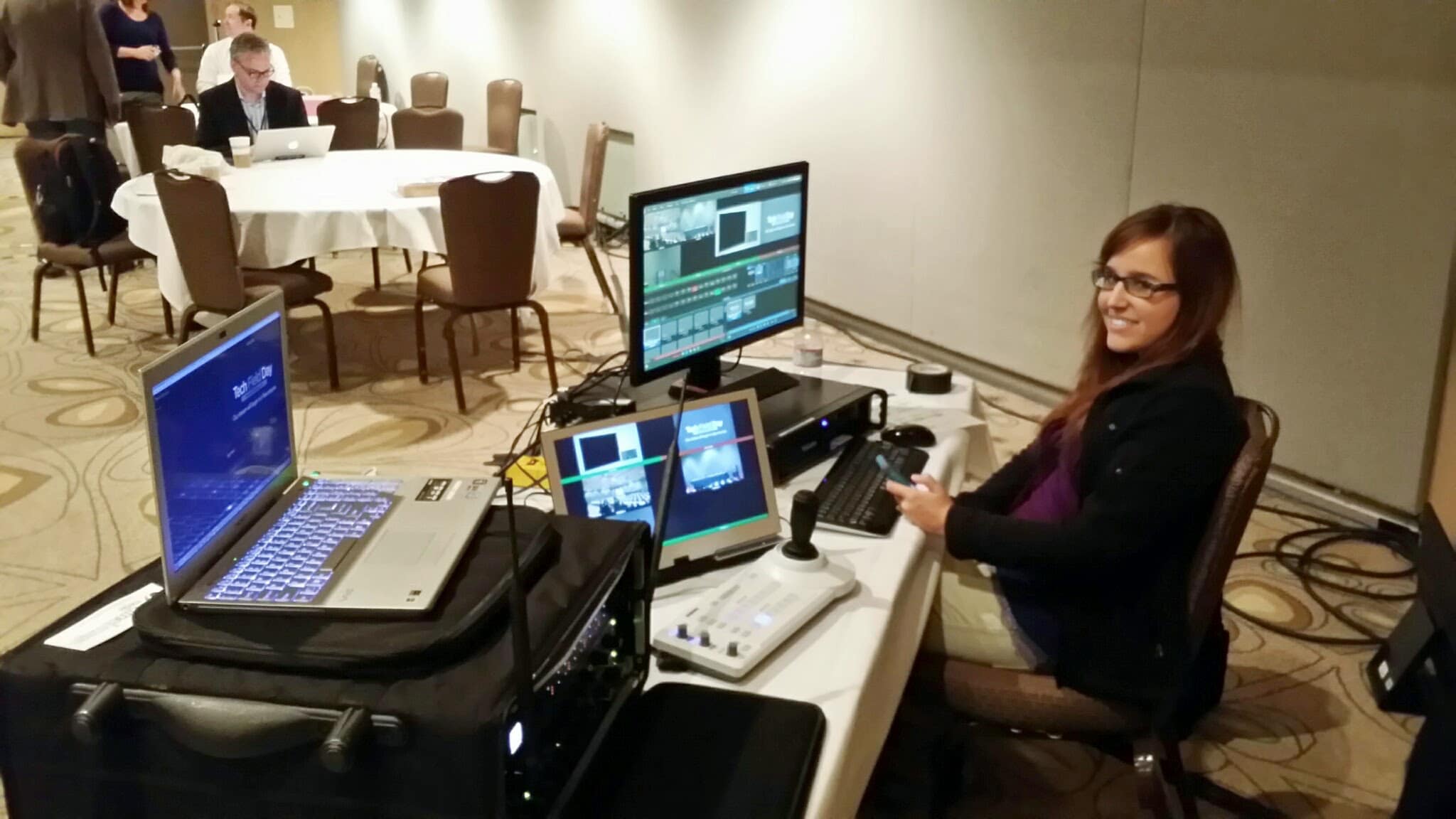 Most PrimeImage Media productions have two to four people working on the crew: two or three people operate Sony cameras that plug into the TriCaster Mini multi-camera production system operated by one person. The fourth input on the TriCaster Mini is usually a direct feed from the presenter’s laptop that displays their PowerPoint presentation. This is done through a scan converter, like the Datavideo DAC-70.