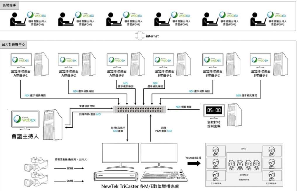 The organizer made extensive use of TriCaster and NDI protocol to turn a computer classroom in National Taiwan University into a broadcast-level production work space. This work space was able to communicate, deliver, and receive high-definition video and audio over a computer network in a high-quality manner suitable for switching in a live production environment. NDI tools come with multiple live screen capture features, without the need to install additional hardware. Even high-cost traditional SDI cables can be minimized by making use of ethernet cables as transmitting medium. While competition candidates located across the globe would only need to connect their webcams to be a part of this revolutionary event.