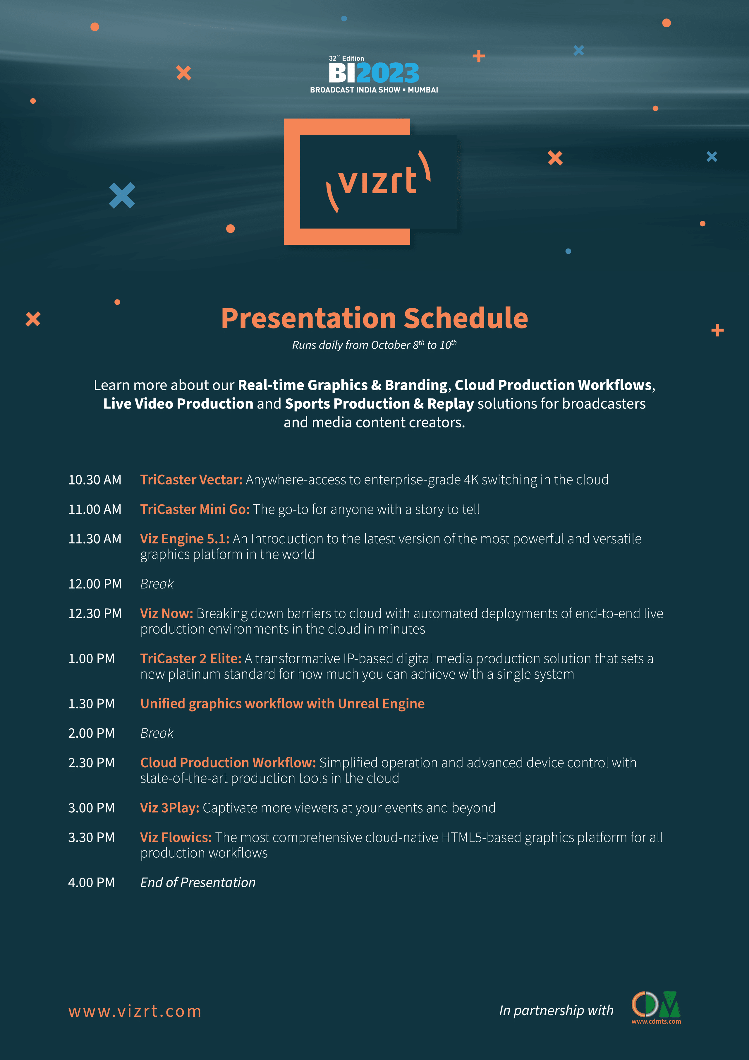 Vizrt experts will be available at the booth to present and demonstrate our award-winning solutions including Viz Now, Viz Engine 5.1 and its seamless Unreal Engine 5 integration, Viz Flowics HTML 5 graphics and how they integrate with our iconic TriCaster range, and more.