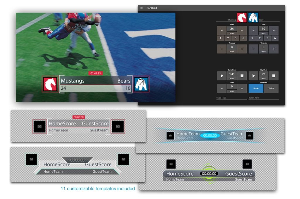 LivePanel comes with 11 customizable scoreboard graphics templates included, ready to give your sports shows a sophisticated look, simply and easily.