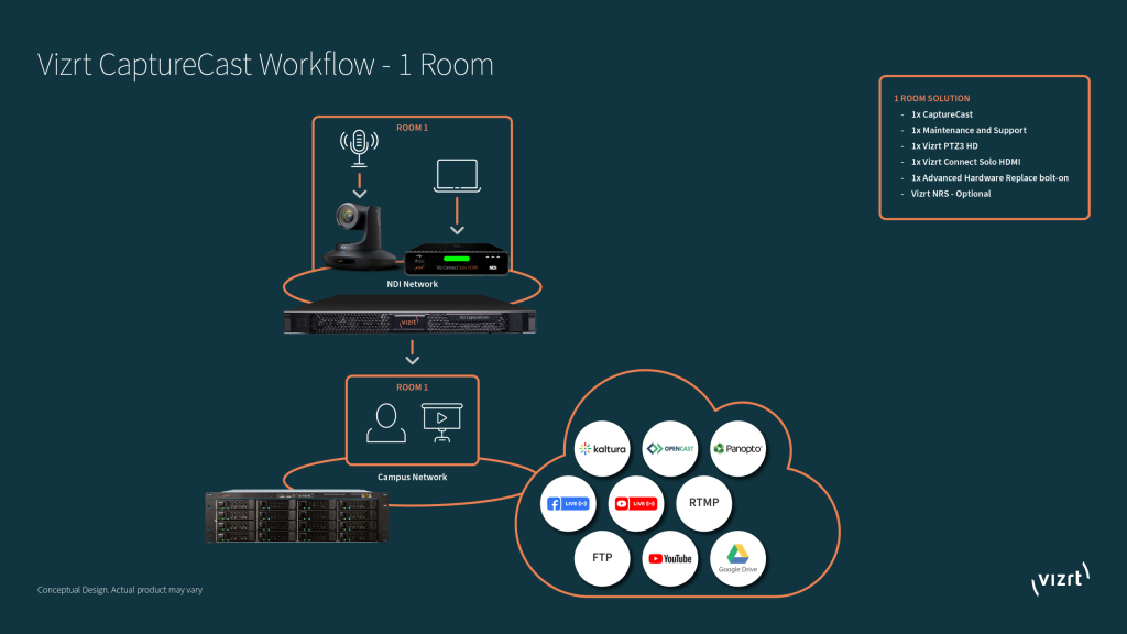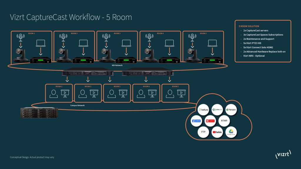 Viz CaptureCast™ is a centralized network-based appliance that enables the Capture, Composition, Streaming and Publishing of classrooms, meeting rooms and events – to anywhere in the world – through industry leading integrations with Kaltura, Panopto, Opencast and more using the power of NDI®.