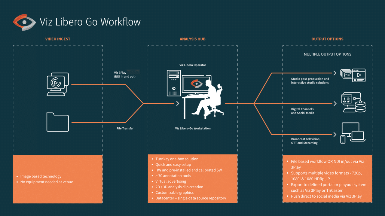 Enhance every replay by analyzing key plays. Extend your sports rights and grow your fan base on all your distribution channels, including social media by combining Viz Libero Go with your Viz 3Play and TriCaster sports productions.
