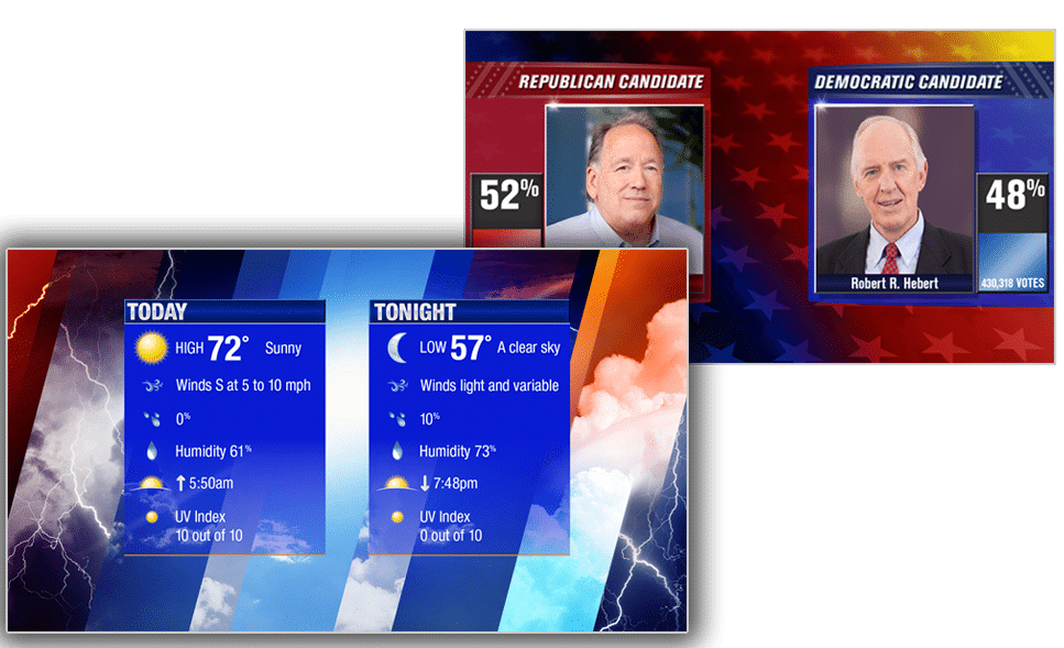 With LiveGraphics, you can have up to 10 simultaneous channels of HD, 3G, or 4K UHD motion graphics available for your production. All assets are rendered in real time, allowing your live, animated graphics to retain their native creative elements—and remain fully customizable up to and including when they hit the air.