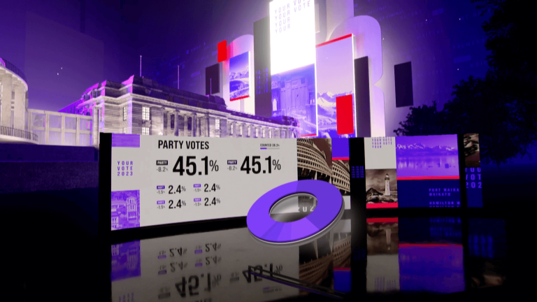 TVNZ brought its 2023 election to life with data-driven 3D and augmented reality graphics powered by Vizrt technologies