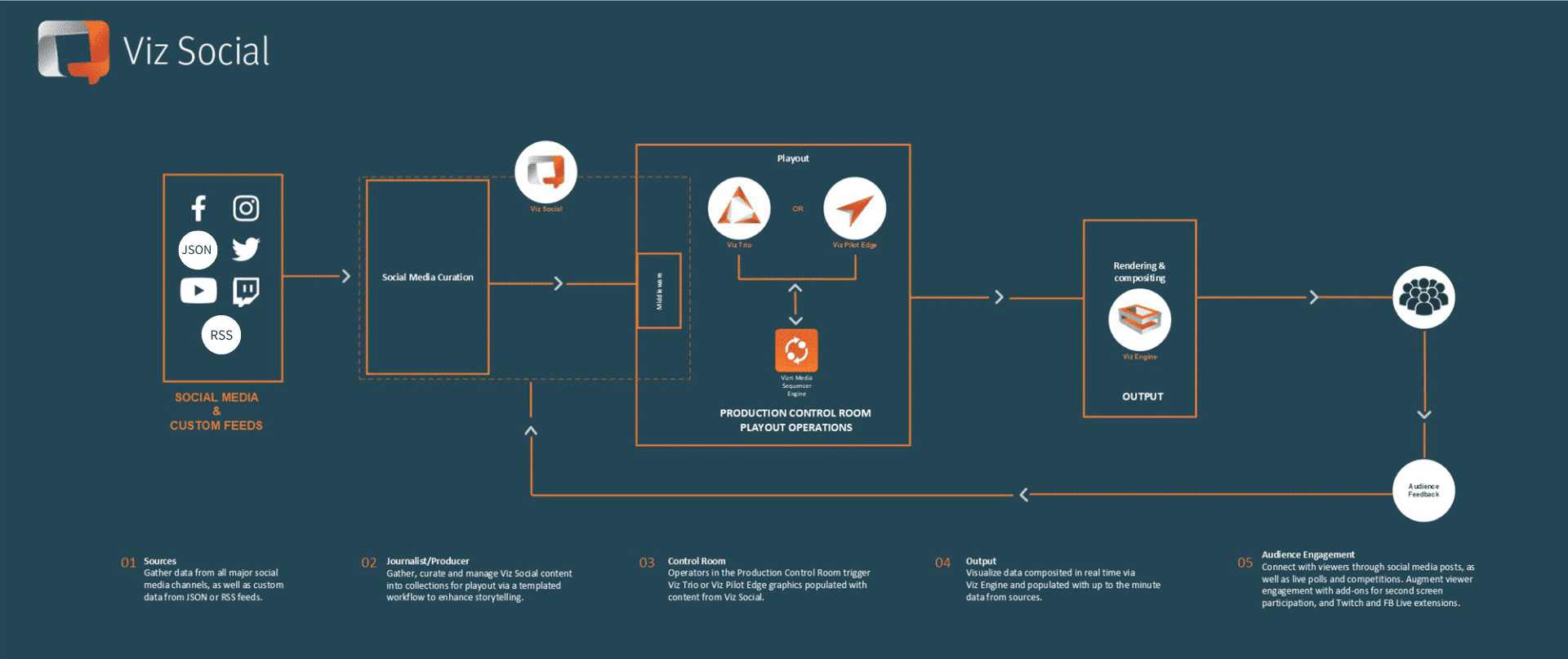 Viz Social combines the powerful cloud-native, browser-based Flowics backend with Vizrt graphics to offer you an easier and more efficient way to curate social media content and better connect with your audience.