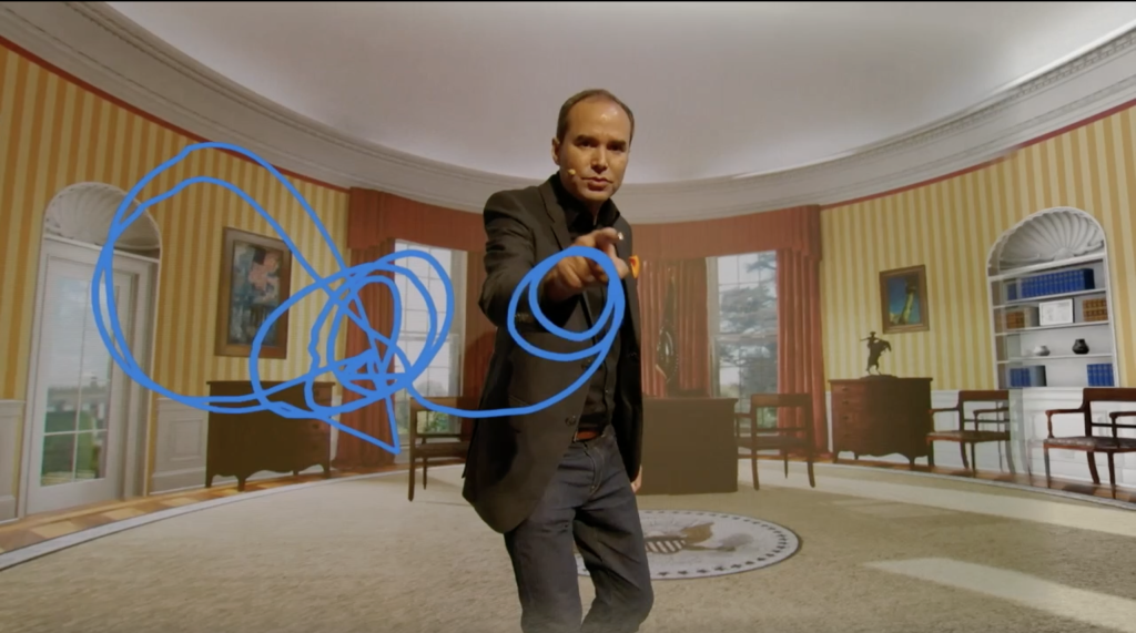 Interactive 3D Line Drawing Tool – The talent, using a designated hand, can draw Augmented Reality lines over real or virtual objects within a virtual or XR set. The lines drawn appear within 3D space according to the camera’s perspective.