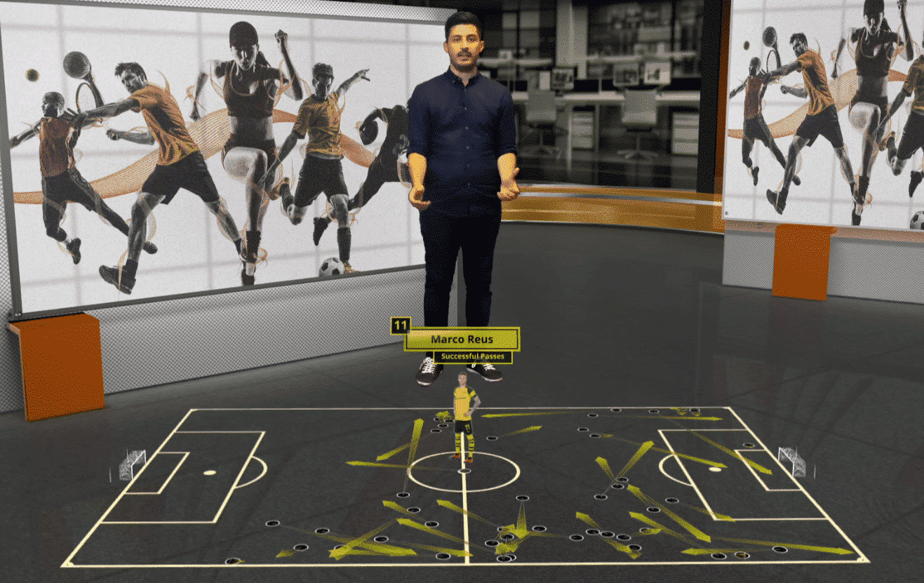 A novel way to visualize data where the playing field is disabled when flying into an Augmented Reality (AR) view. Virtual field lines are combined with the Transparent AR view to place the image on the studio floor. Gives pre and post-match broadcasts a lot more impact with data-infused analysis.