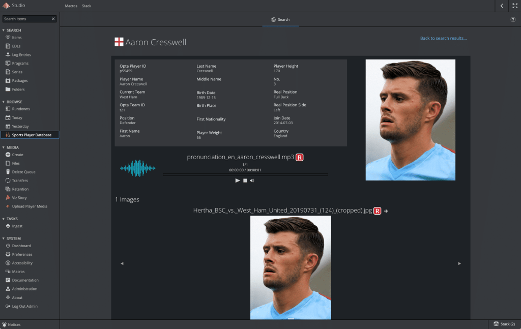 A new optional extra, the Sports Data Integration offers integration with Opta sports feeds (and provides foundations for integration with other sports data providers in the future). With this, Viz One can monitor unmanaged file storages, pull in live feeds, and automatically create logtrack entries against the assets. It can be configured to accept feeds in various formats, allowing for the automated population of assets with a variety of useful metadata, including in-game events such as goals, chances, fouls, etc. as well as detailed player data, so you can build up comprehensive directories with information about players, teams, stadia, and match officials. The workflow can help add value to collections, enrich content, and reduce the effort required in manually logging content in a Viz One system.
