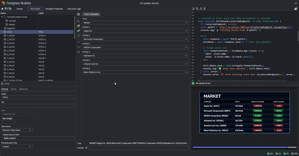 Live data templates can now be written to fetch and auto-update data right before the graphics is taken on air, or even while on air. This is done by using the Vizrt Pilot Update Service (installed with Pilot Data Server) to execute JavaScript templates written in Template Builder or by implementing custom scripts. No need to manually trigger the updates.